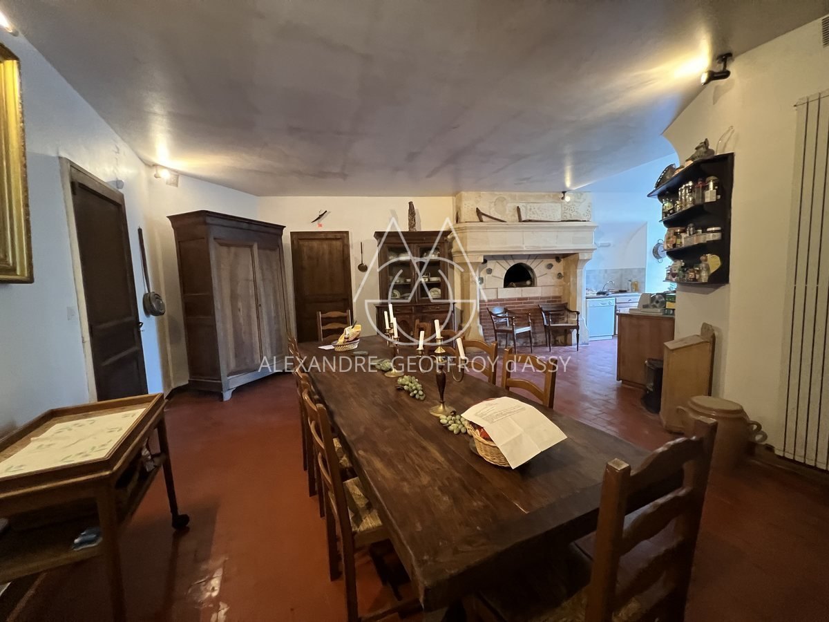 Face à l'entrée, une grande cuisine en L avec son impressionnant four à pain, sol en tomettes rouges, son accès direct à une terrasse vue sur la piscine.