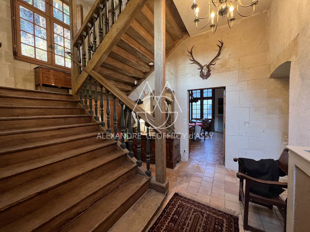 Le Manoir RDC : Après avoir poussé cette fabuleuse et impressionnante porte en bois du XV° l'entrée donnant sur ce majestueux escalier en bois, puis desservant une pièce à vivre de 65 m² très lumineuse et une vaste cuisine avec son immense cheminée en pierre.